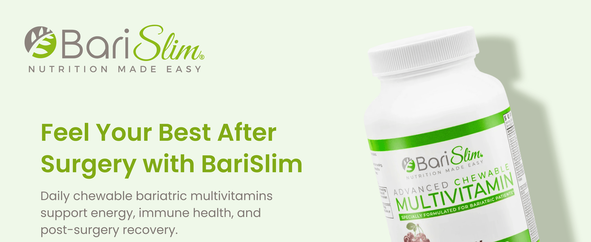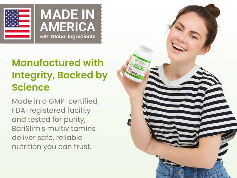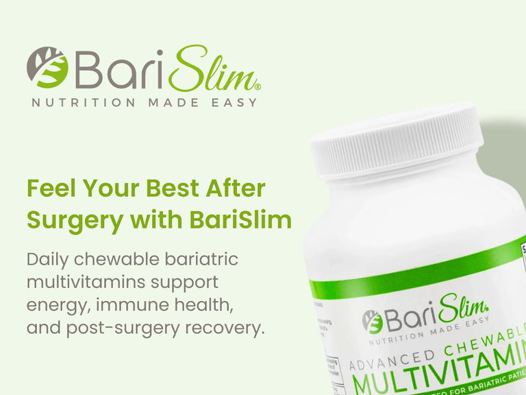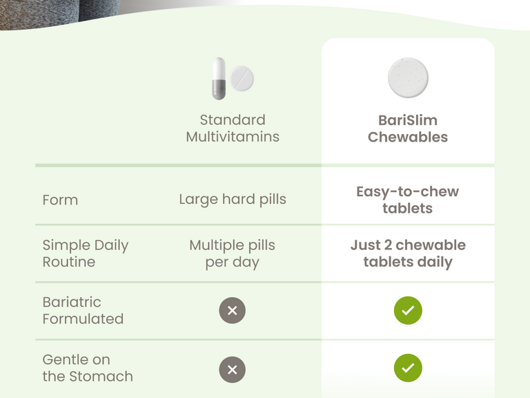 āComprehensive Post-Bariatric Support: BariSlim's Advanced Chewable Bariatric Multivitamin Tablets are expertly crafted to provide comprehensive nutritional support following bariatric surgery, catering to the needs of gastric bypass and gastric sleeve patients. Each chewable tablet delivers potent vitamins and minerals to promote steady energy, strong immunity, and long-term wellness during the crucial post-surgery phase.