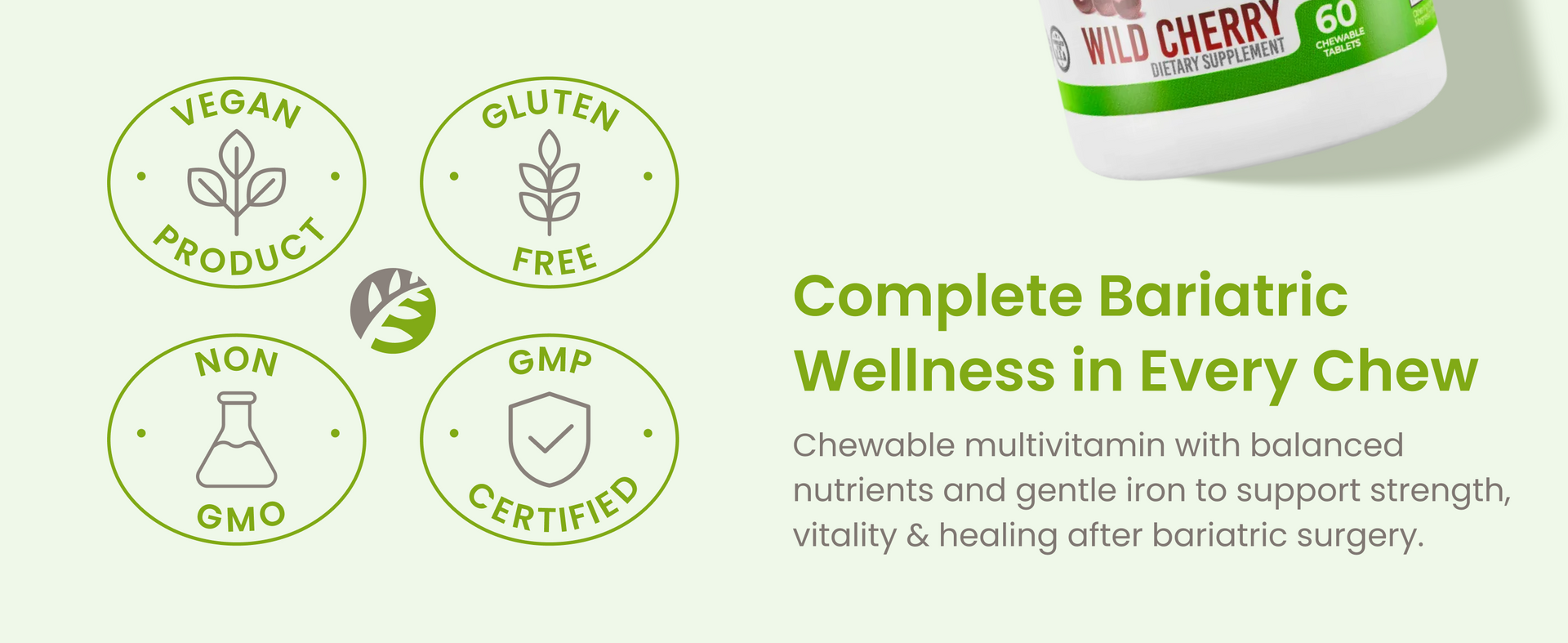 āDelicious, Easy-to-Chew Wild Cherry Flavor: Make daily supplementation a delight with our wild cherry-flavored chewable tablets. Forget swallowing large pills. These smooth, wild cherry-flavored chewables taste great and dissolve easily. No chalky aftertaste. No bitterness. Enjoy your daily vitamins like a treat while fueling your body with everything it needs to thrive post-surgery.