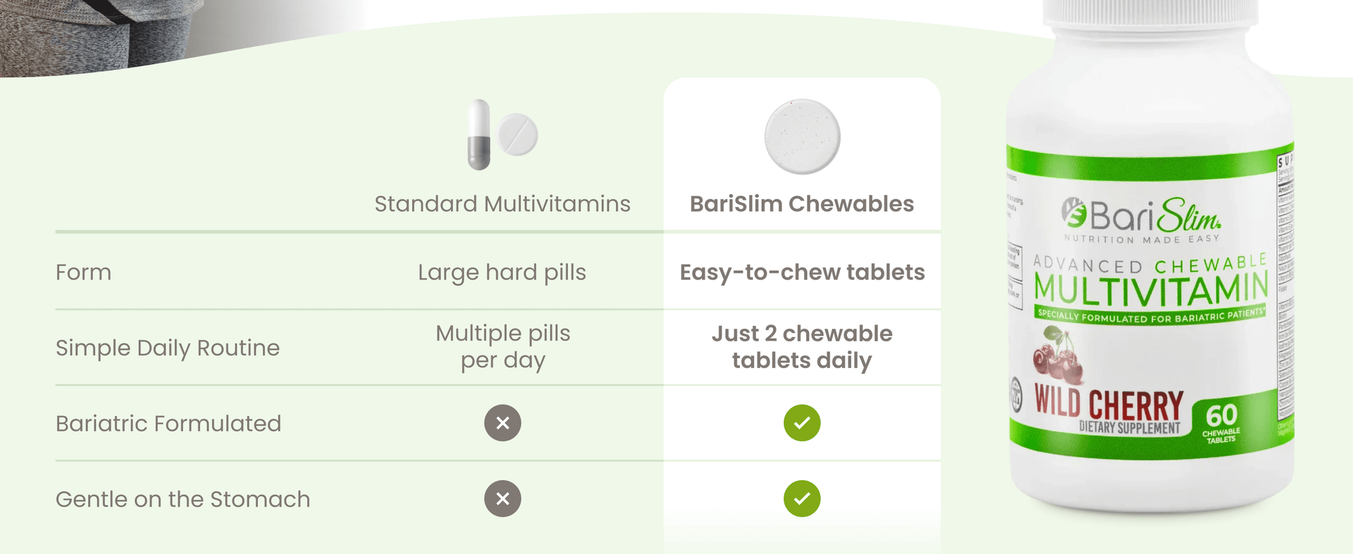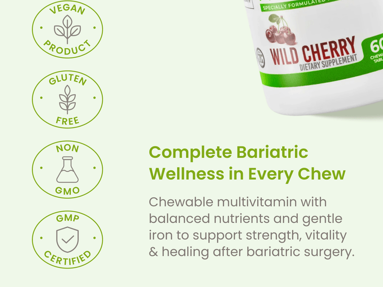āDelicious Wild Cherry Flavor with No Added Sugar: Enjoy your daily vitamins with a naturally refreshing wild cherry flavor thatās smooth and easy to chew, never chalky or bitter. These sugar-free bariatric multivitamins make post-surgery nutrition simple and satisfying, with no artificial colors, flavors, or aftertaste.