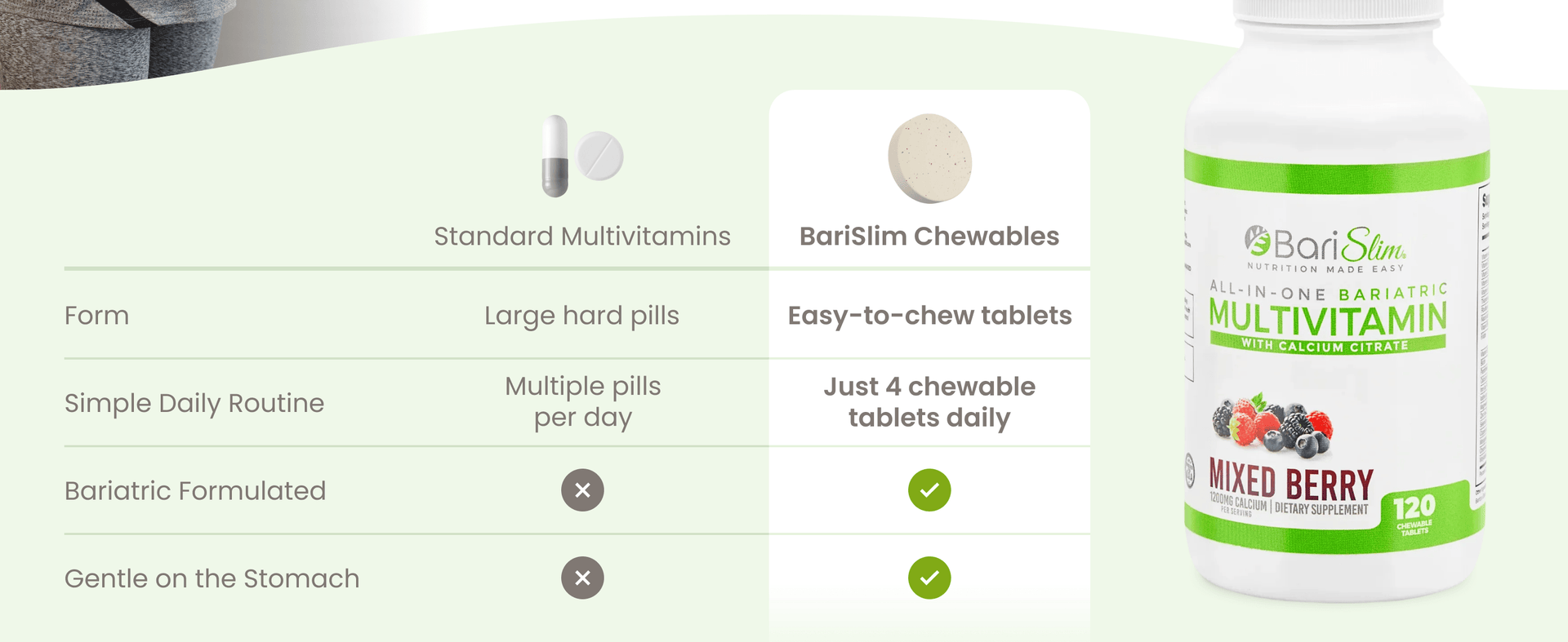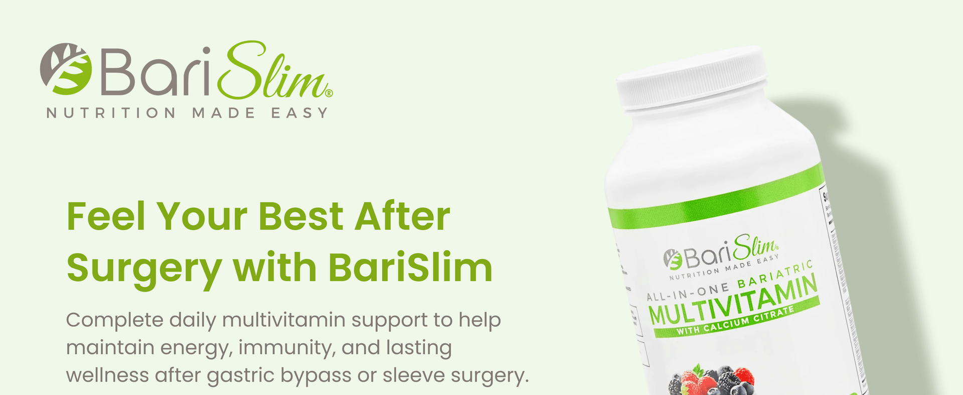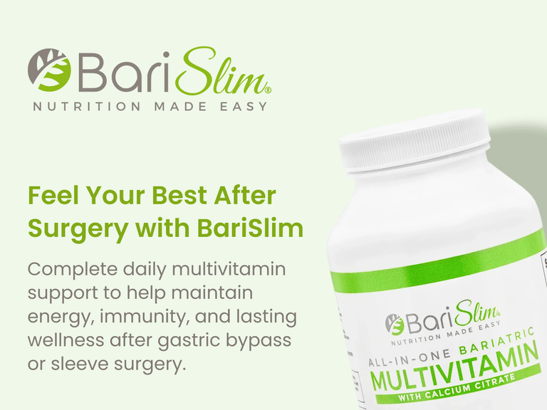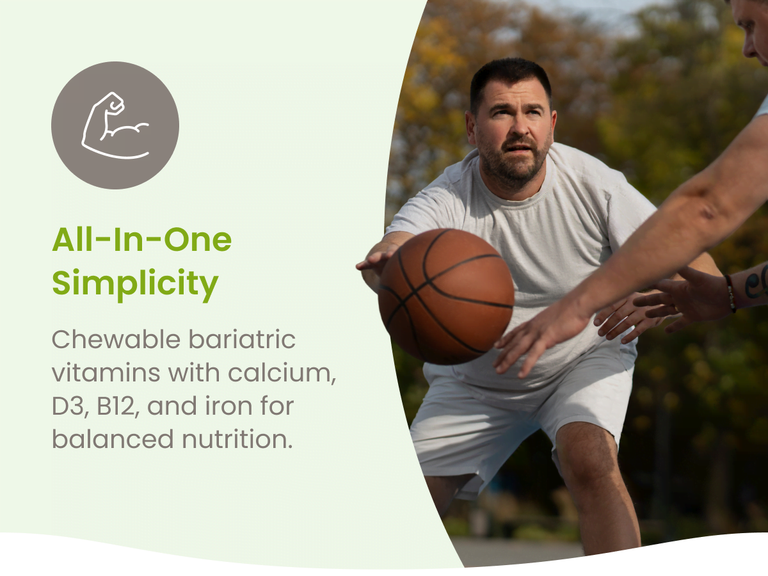 βAll-In-One Support for Life After Bariatric Surgery: Created especially for post-bariatric patients, BariSlimβs all-in-one chewable multivitamin with calcium citrate, vitamin D3, iron, and B12 delivers the complete daily nutrition your body needs after gastric bypass or sleeve surgery. Designed to simplify your supplement routine, it helps you stay consistent and confident in your recovery journey.