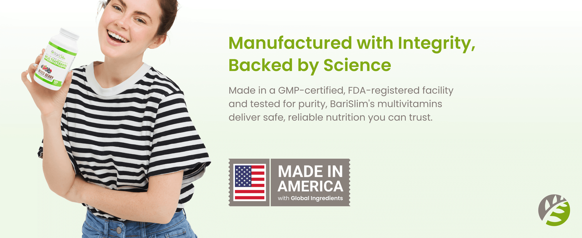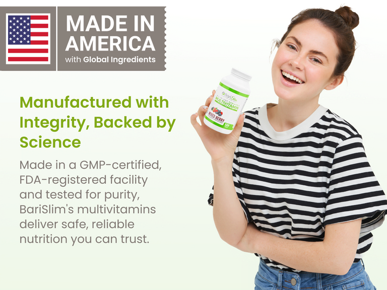 βTrusted Quality from Barislim: Proudly made in the USA in a GMP-certified facility and third-party tested for purity, BariSlimβs bariatric-friendly vitamins are designed exclusively for your post-surgery needs. Each bottle includes 120 chewable tabletsβyour complete, all-in-one solution for ongoing bariatric health and confidence. Ready to simplify your daily nutrition? Add to Cart now and take the next step toward lasting wellness and vitality with BariSlim.