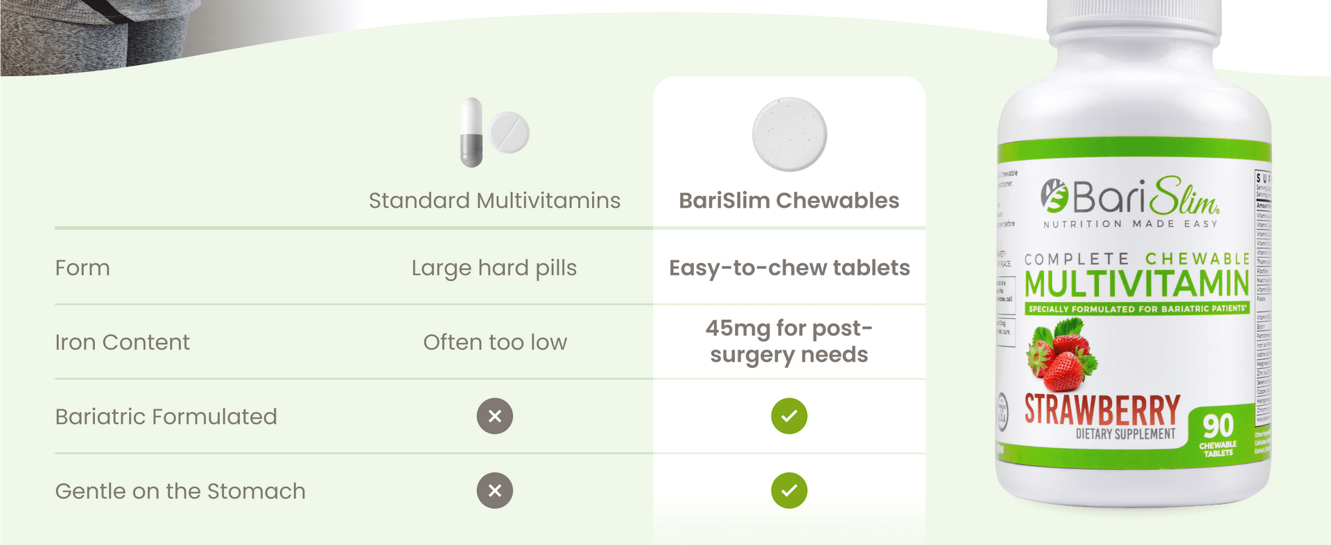 Bariatric multivitamins are designed to help support your new system after weight loss surgery. They contain higher levels of vitamins and minerals and are designed for easy digestion and absorption.