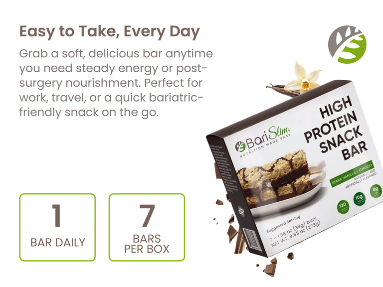 ✔High Protein Support for Post-Bariatric Recovery: Our BariSlim high-protein snack bar is specially designed to meet the nutritional needs of individuals focused on maintaining a balanced diet after weight loss surgery. Packed with high-quality protein and essential nutrients, it helps to maintain lean muscle, steady energy, and lasting fullness throughout your day.